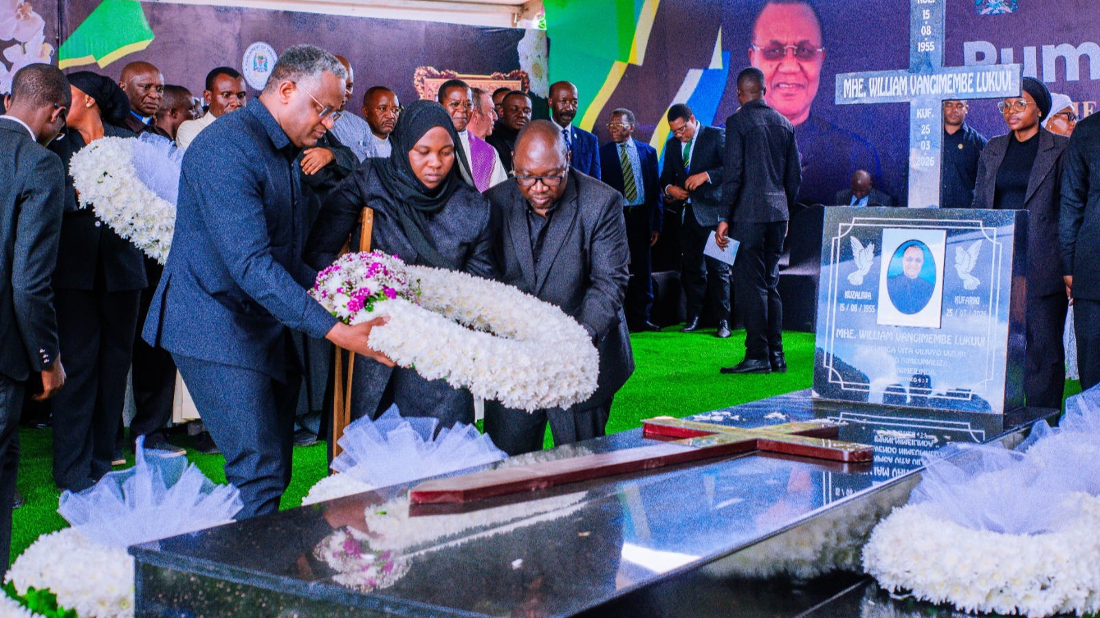 Viongozi wengine walioshiriki mazishi hayo ni Mhandisi Isaack Kamwelwe, Katibu Mkuu Wizara ya Mifugo na Uvuvi, Prof. Elisante ole Gabriel, Mkuu wa Mkoa wa Geita, Mhandisi Robert Gabriel na baadhi ya Wabunge.